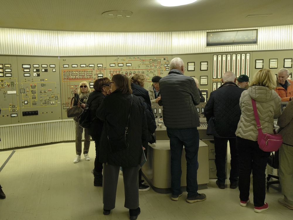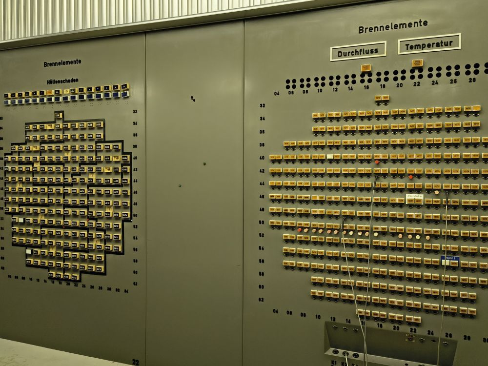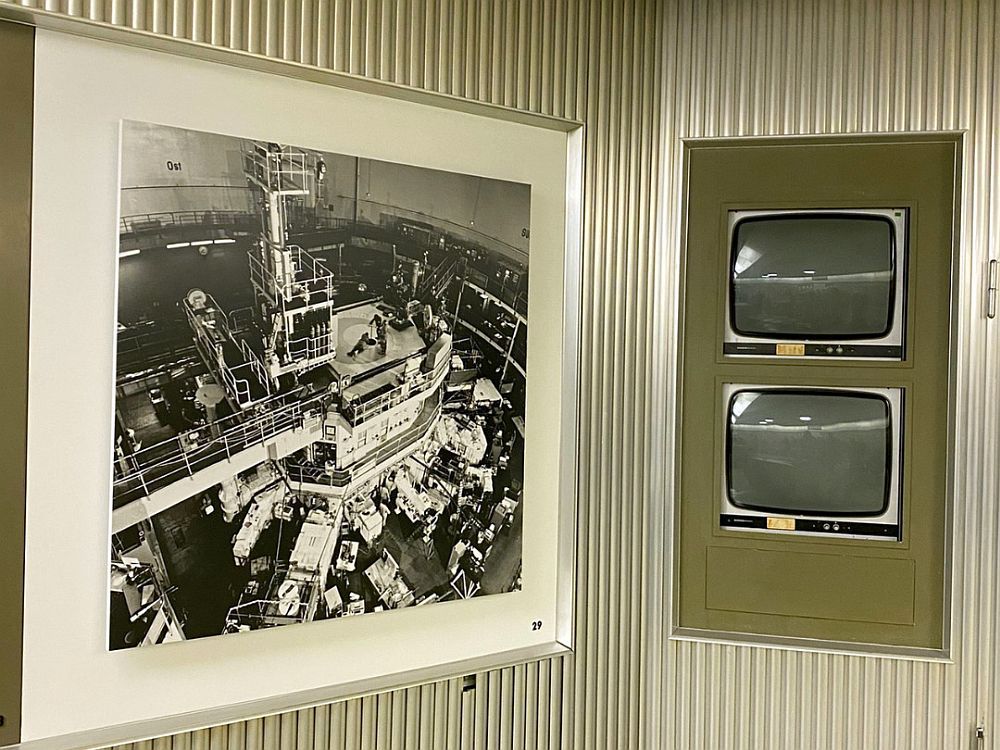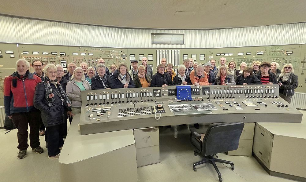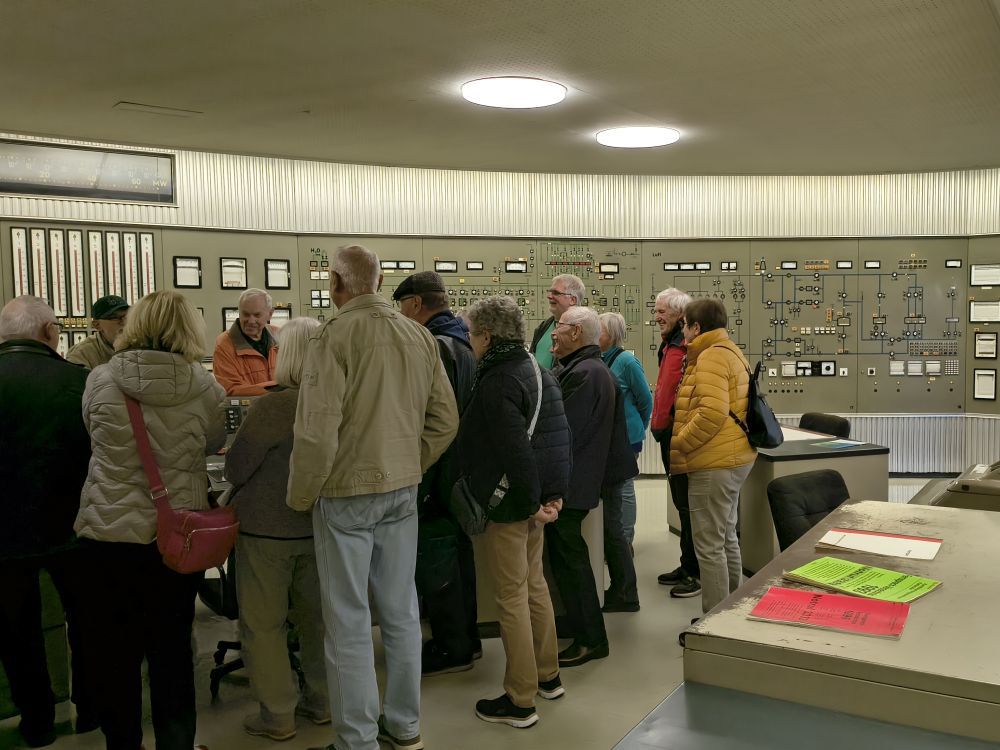 Anschließend war eine Besichtigung des Kernforschungsreaktors (FR 2) der im Jahre 1957 entstand. Der FR 2 wurde mit 53 Brennelementen am 07. März 1962 erstmals hochgefahren und erreichte im Dezember 1962 seine Nennleistung. Im Originalkontrollraum mit Schaltpult und unzähligen Kontrolllichtern, Schalttafeln und diversen Kontrollanzeigen wurde uns der Arbeitsplatz der Schichtmannschaft gezeigt in dem nach 20 Jahren im Dezember 1981 die Letztabschaltung des FR 2 vorgenommen wurde. Anschließend wurde der FR 2 in den gesicherten Einschluss verbracht.